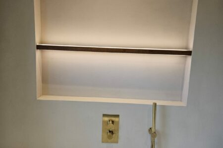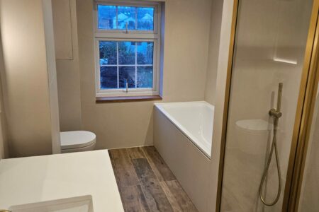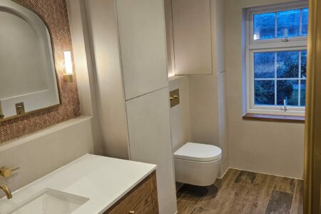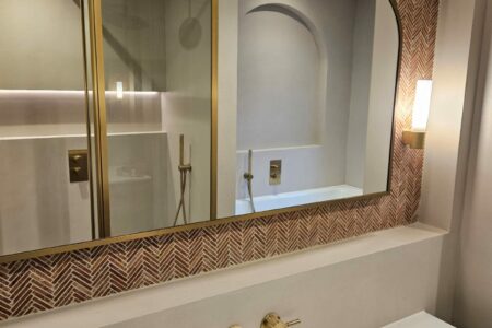 Elegant bathroom showcasing ClaudiCemetno RM microcement , Oyster-coloured microcement finishes, expertly installed by the SOBO team.This space features a harmonious blend of soft tones, modern fixtures, and thoughtful lighting, creating a refined and tranquil atmosphere.