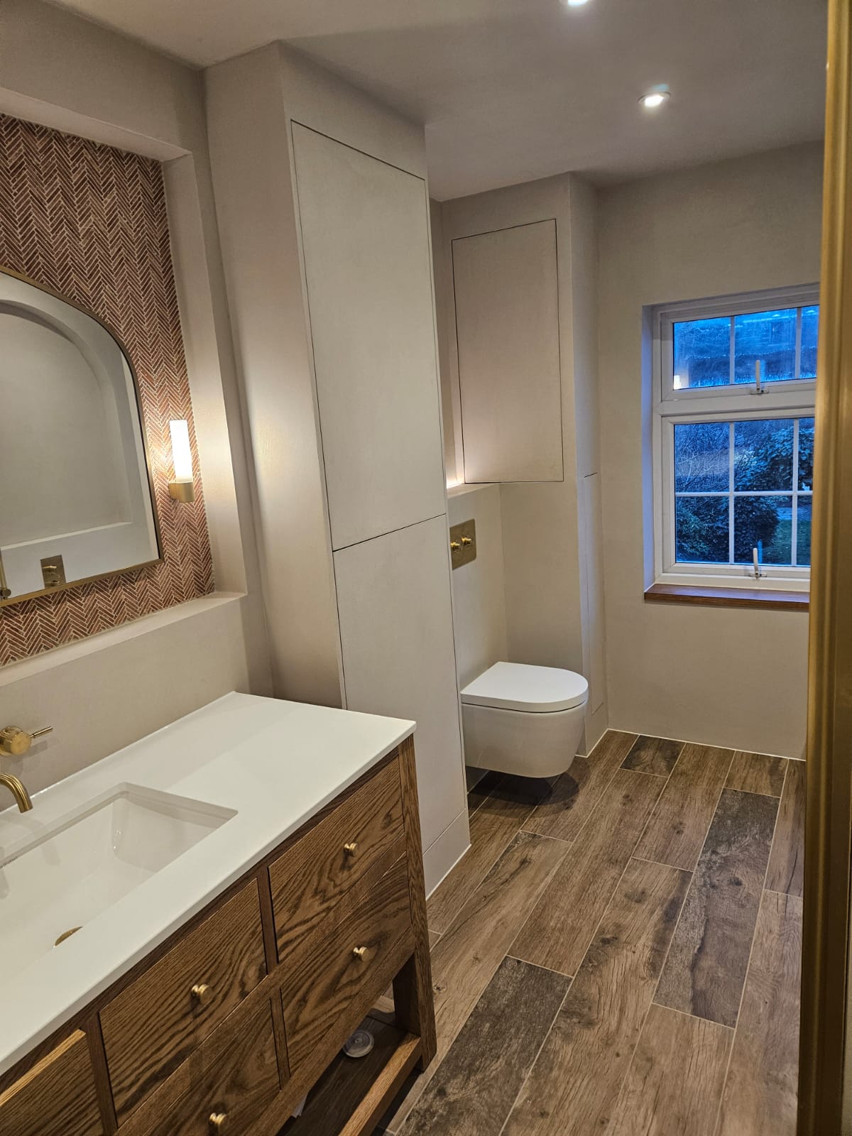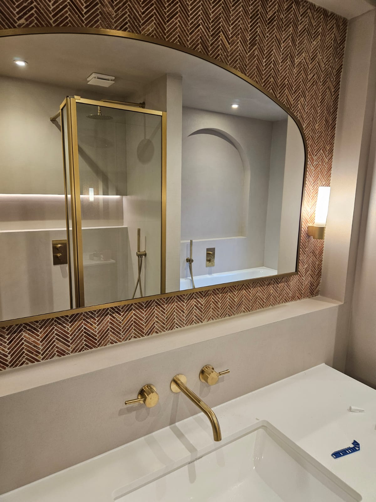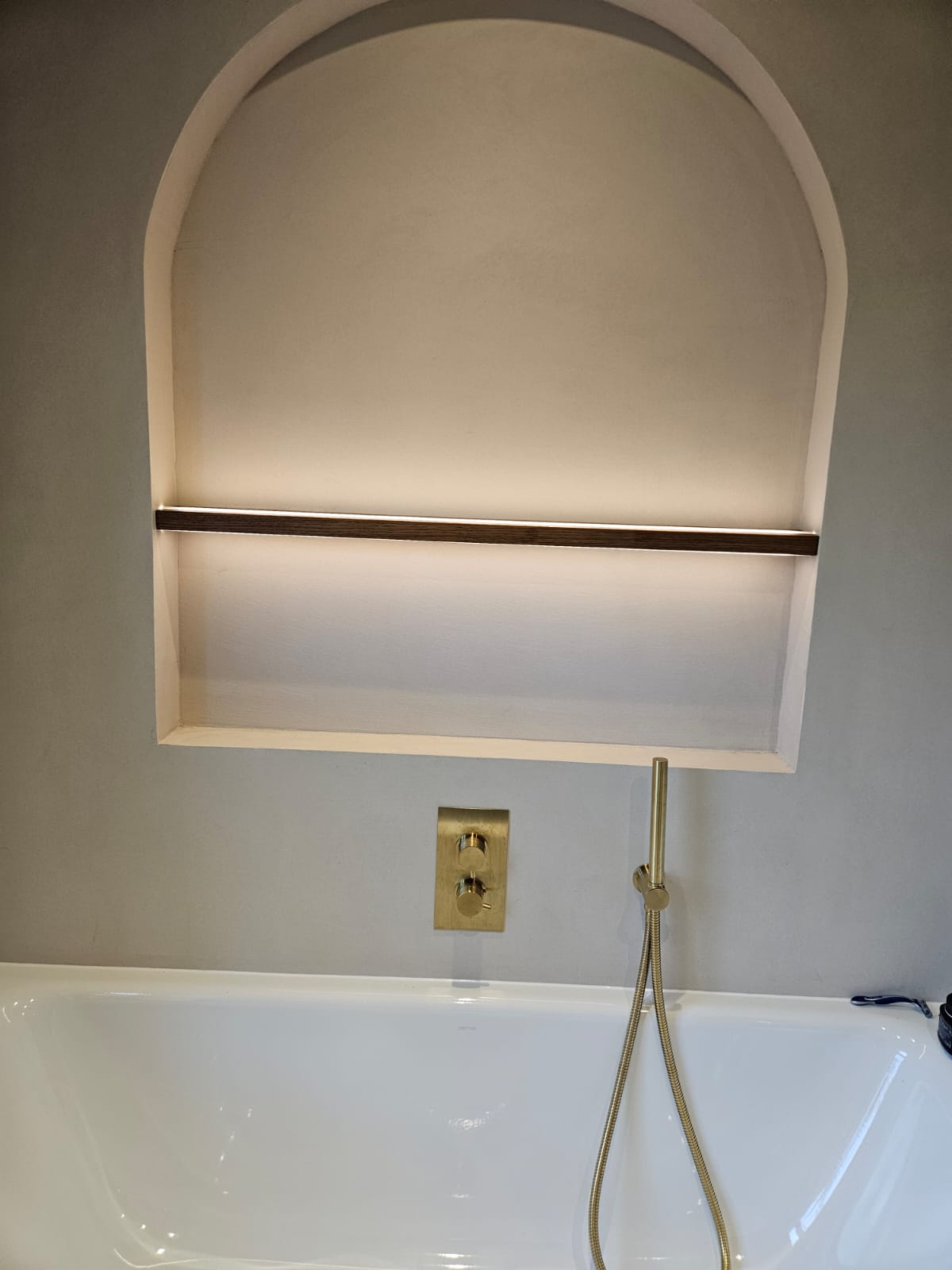 Elegant bathroom showcasing ClaudiCemetno RM microcement , Oyster-coloured microcement finishes, expertly installed by the SOBO team.This space features a harmonious blend of soft tones, modern fixtures, and thoughtful lighting, creating a refined and tranquil atmosphere.