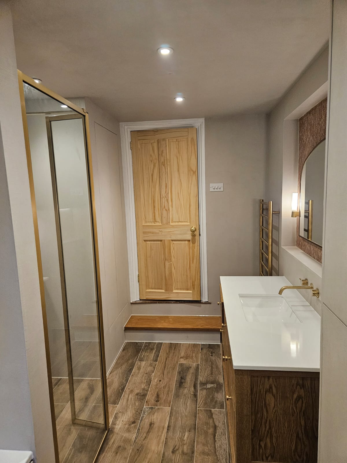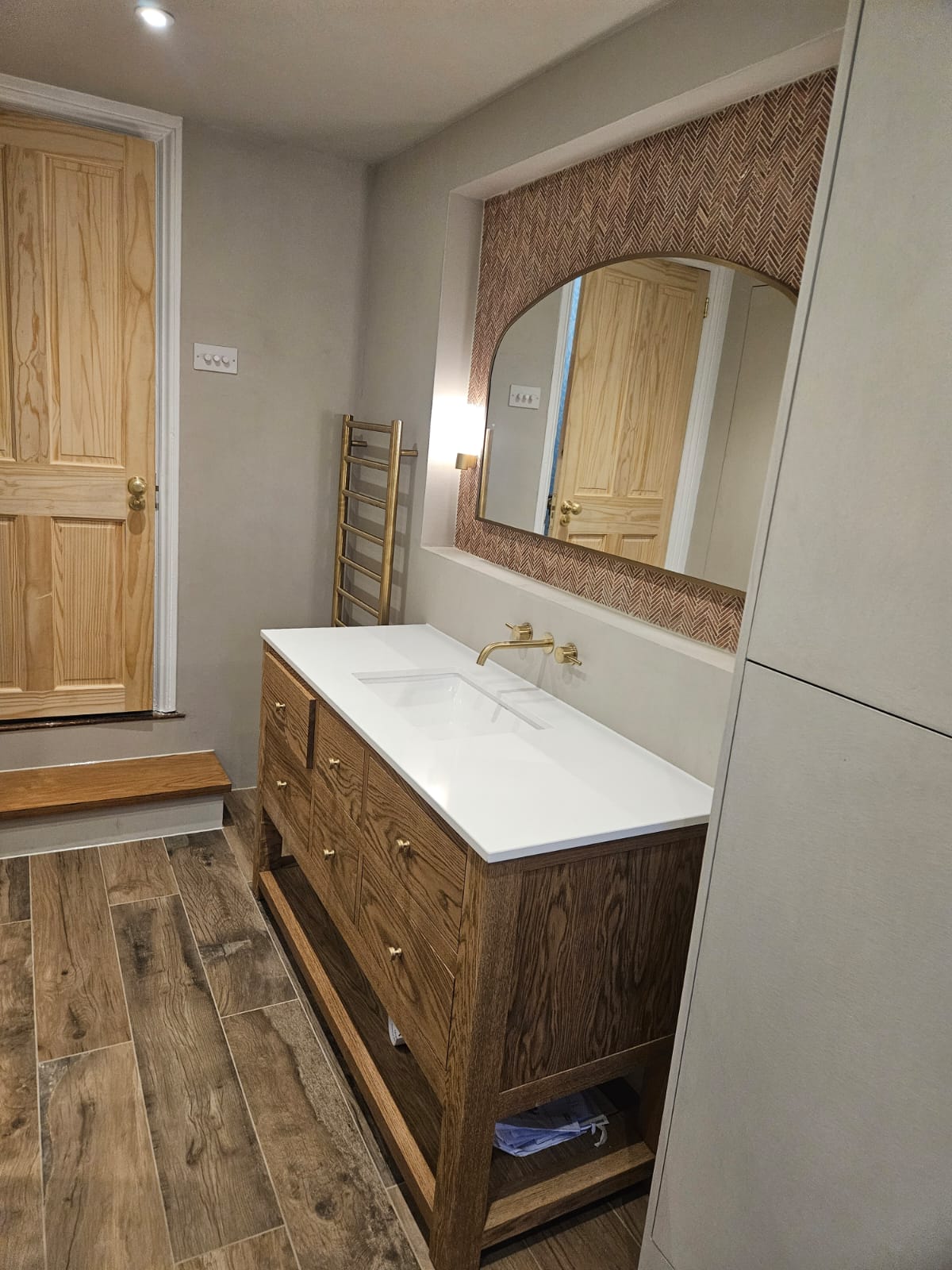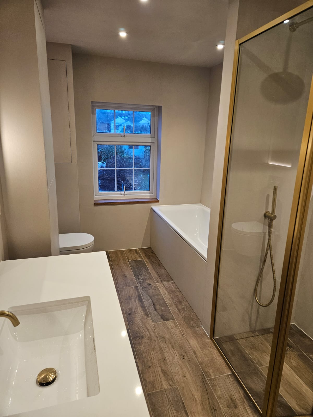 Elegant bathroom showcasing ClaudiCemetno RM microcement , Oyster-coloured microcement finishes, expertly installed by the SOBO team.This space features a harmonious blend of soft tones, modern fixtures, and thoughtful lighting, creating a refined and tranquil atmosphere.