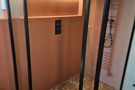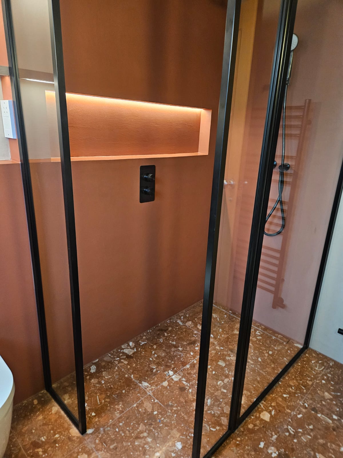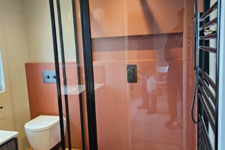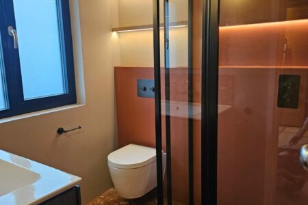 Contemporary bathroom featuring high-quality fittings and bespoke microcement installation by the SOBO team, with interior design by North Arch Bathrooms. The space combines modern finishes, integrated shelving, and creative use of lighting for a stylish and functional result.